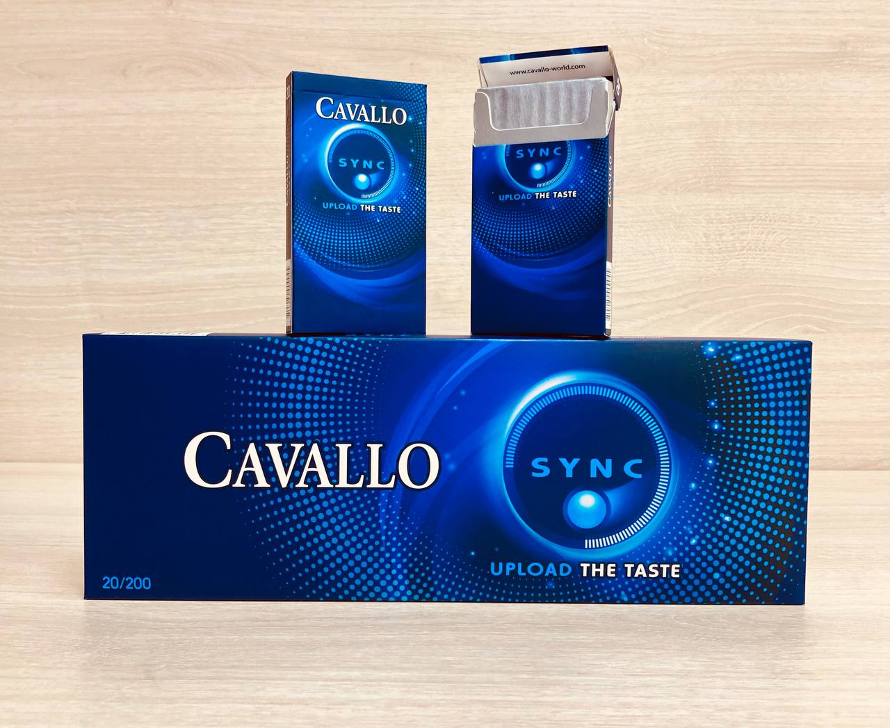 Дизайн пачки Cavallo Sync выполнен в футуристичном стиле: глубокий тёмный фон, элементы, напоминающие цифровые паттерны, неоновая графика. Это подчёркивает «технологичность» линейки и делает её визуально заметной среди других суперслим-серий Cavallo. На рынке серия известна как товар с современным стилем подачи — часто выбирается покупателями, ориентирующимися на яркую, «цифровую» эстетику упаковки.